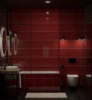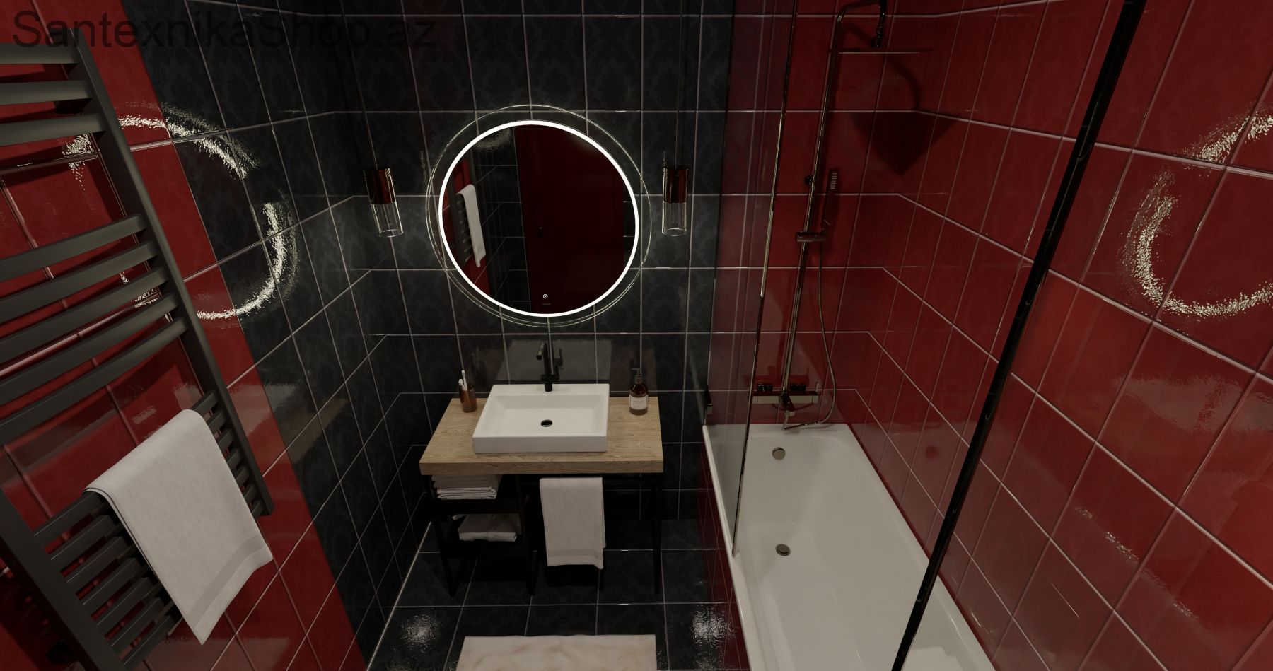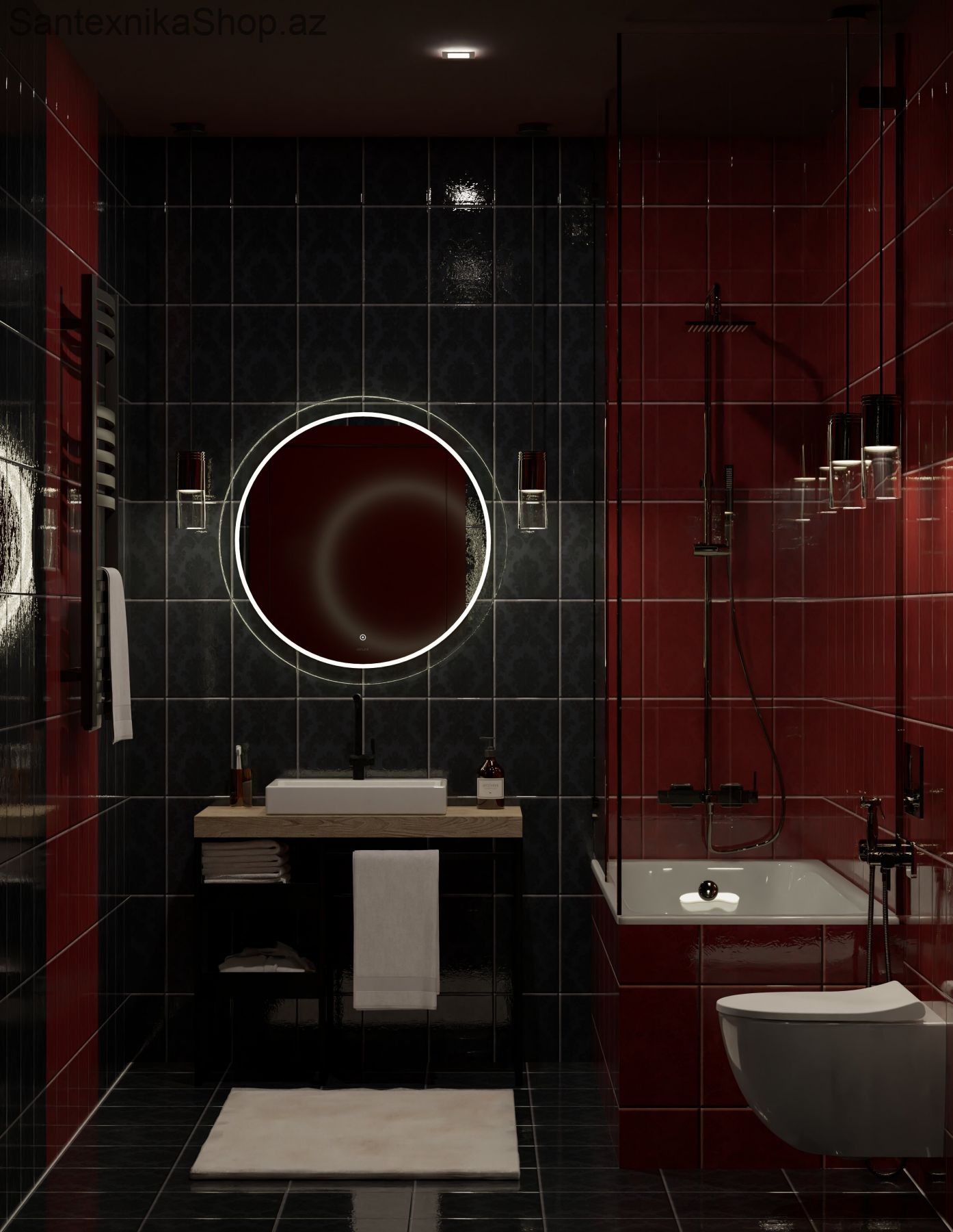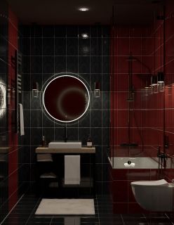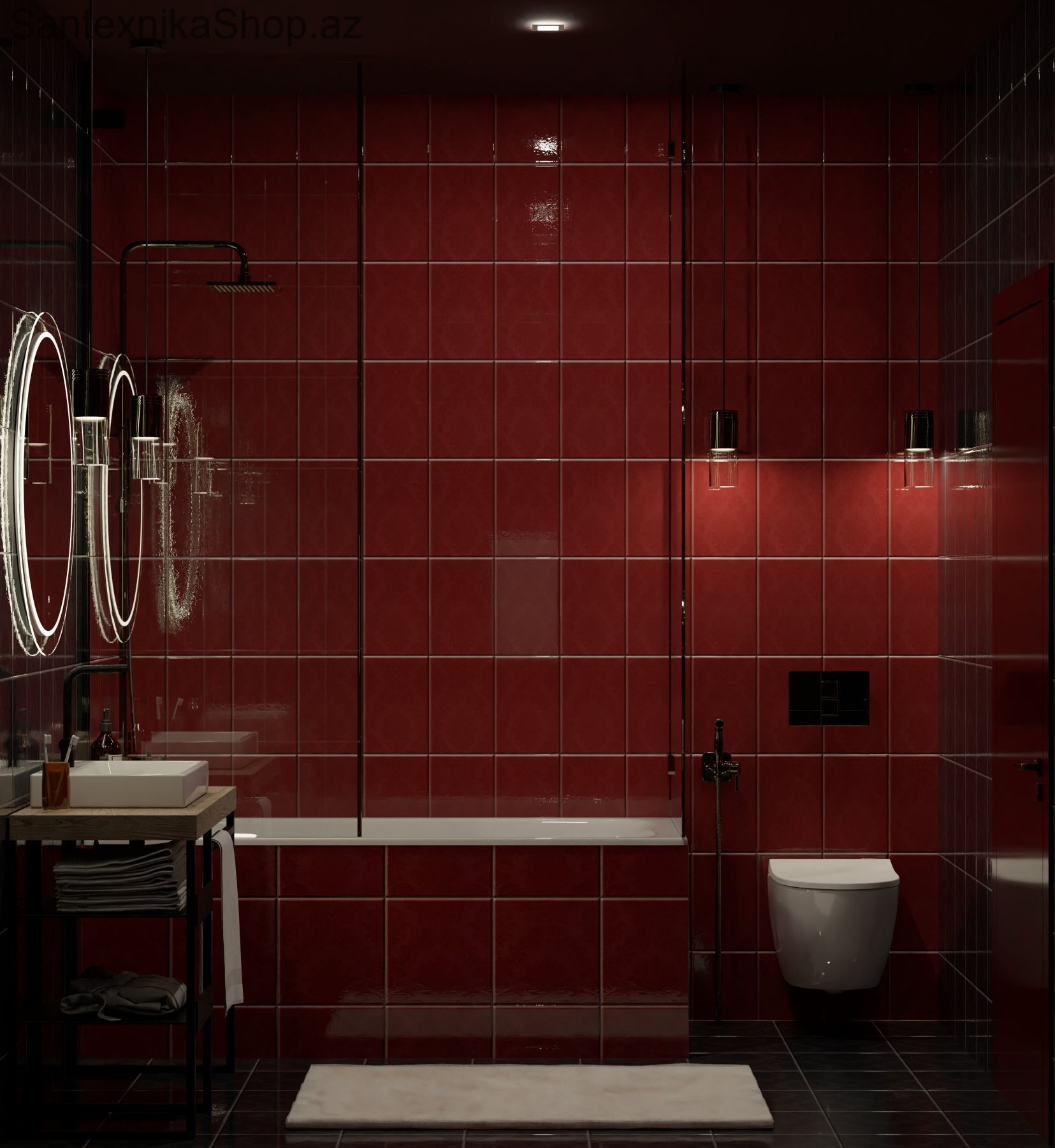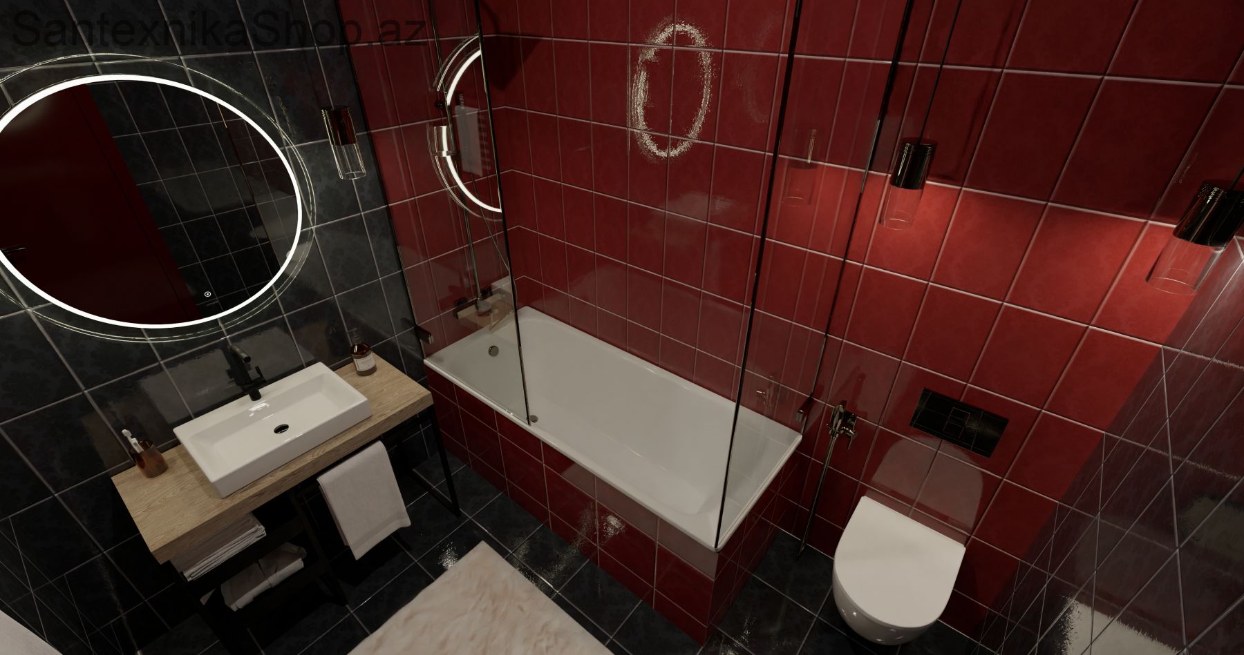 Bu qırmızı və qara hamam dizaynı dramatik və lüks estetika təmin edir, qırmızı parlaq divar plitələri və qara naqışlı plitələrlə zənginləşdirilmişdir. Dairəvi LED işıqlı güzgü yumşaq işıqlandırma yaradır, qara isitici radiator və taxta tonlu yumaqüstü dolabı funksionallığı artırır. Şüşə ekranla qapalı vanna, qara metall armatürlər və ağ divar tualeti klassik elementləri müasir toxunuşla birləşdirir. Qara yer plitələri və ağ xalça isə kontrastlı və rahat atmosfer formalaşdırır. 3D renderlərlə təqdim olunan bu model cəsarətli içlər axtaranlar üçün ideal seçimdir.