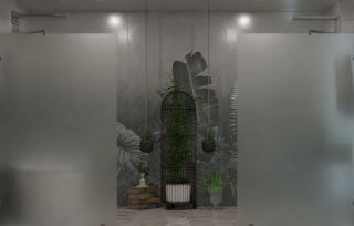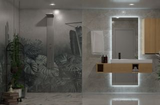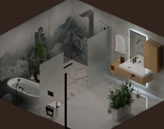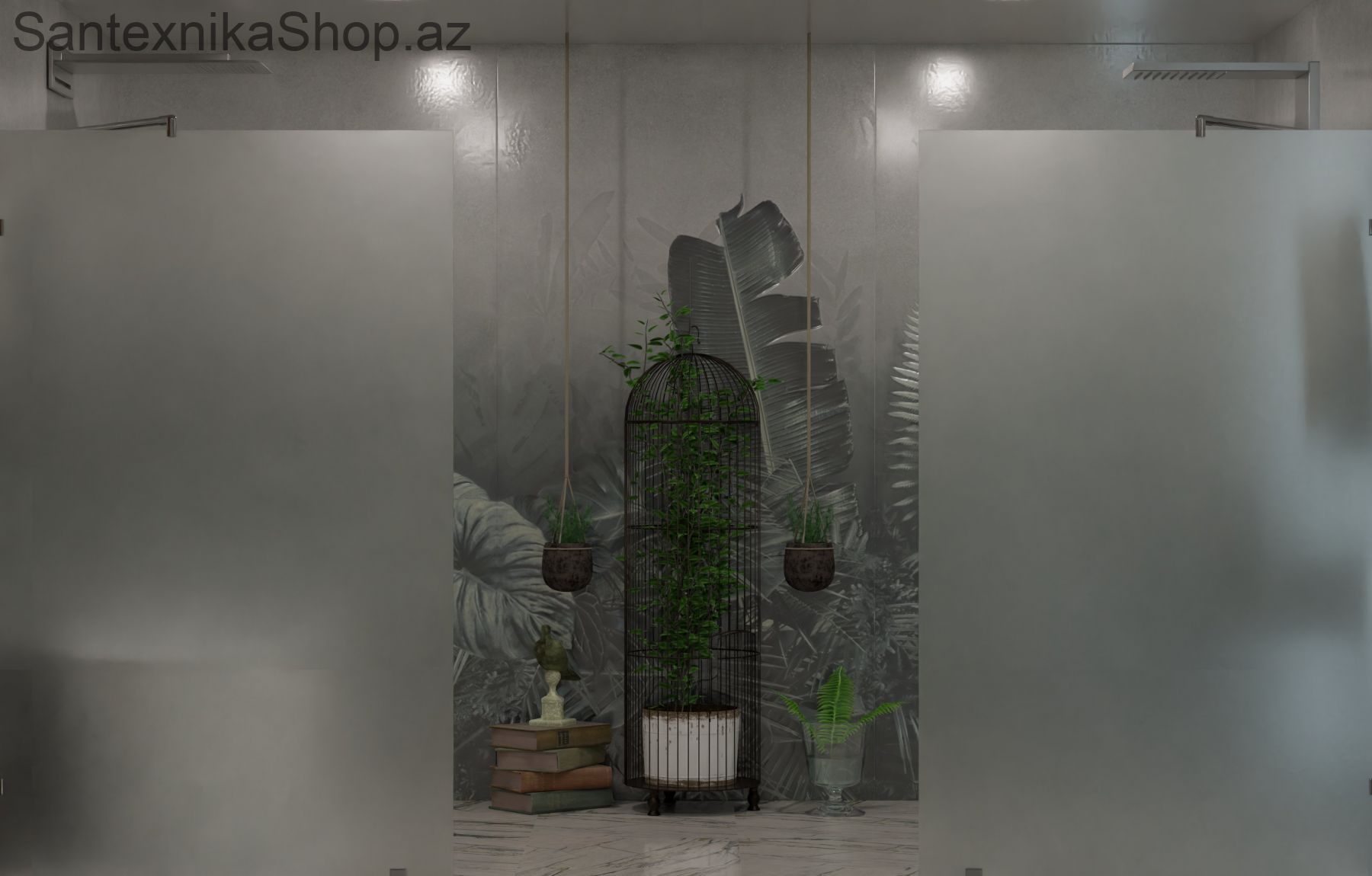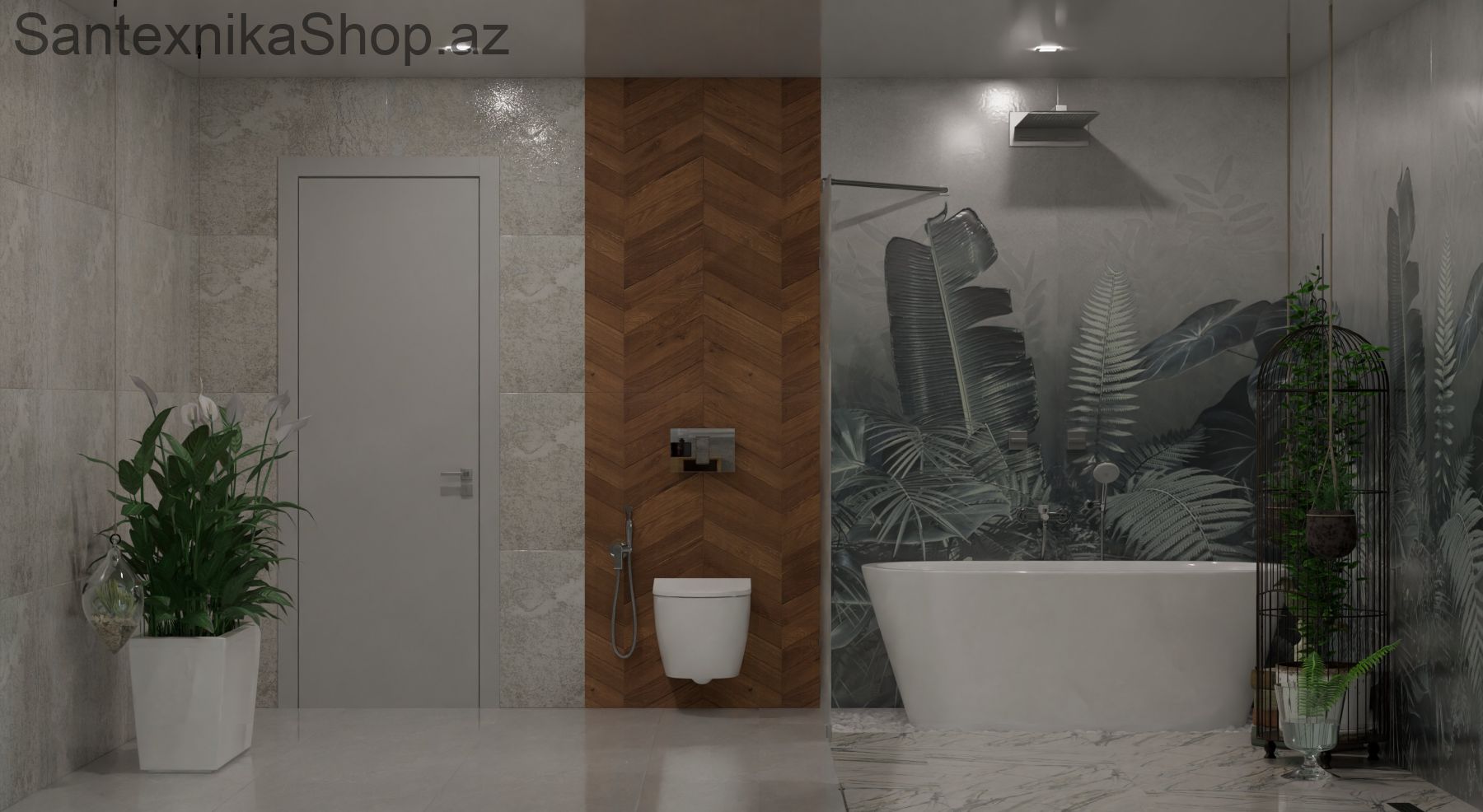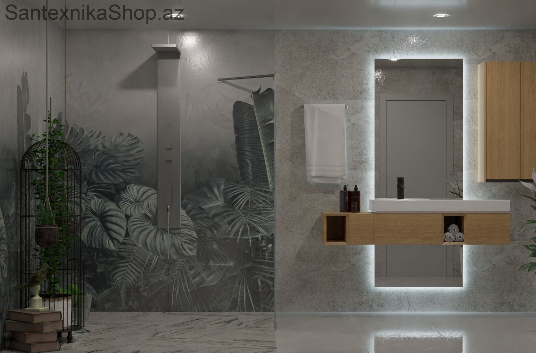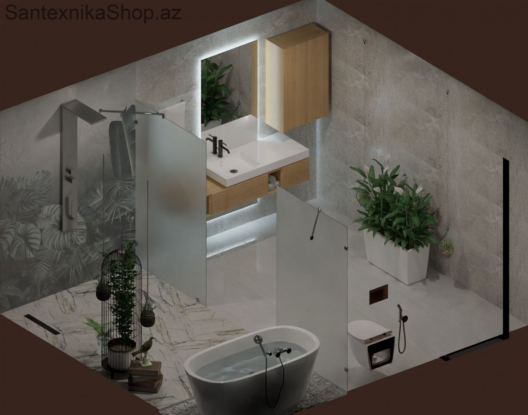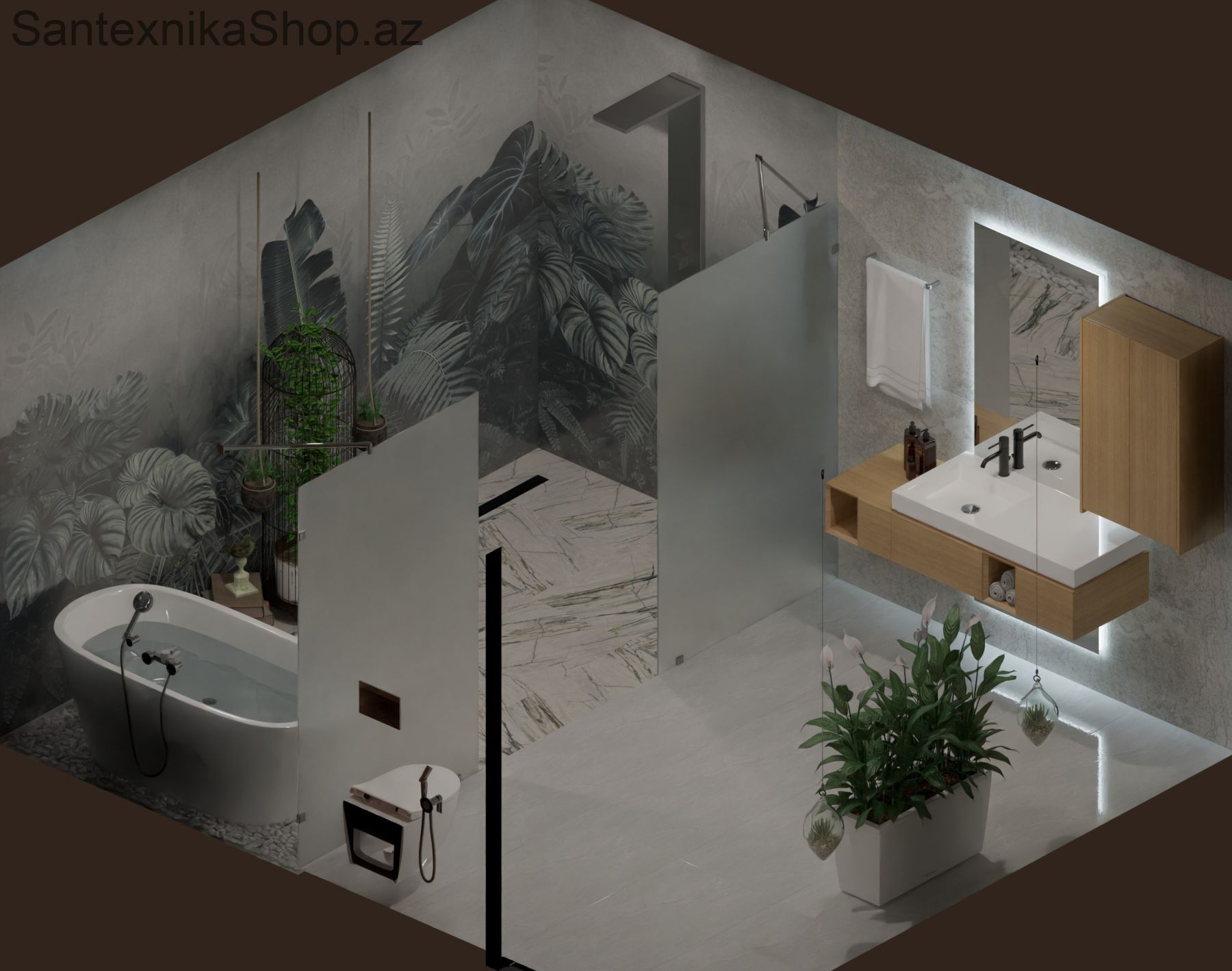 Bu tropik hamam otağı dizaynı, təbii mədəniyyəti və müasir texnologiyanı birləşdirir. Divarlardakı yaşıl bitki naqşları və daş teksturlu lövhələrlə bəzədilmiş otaqda, işıqlı ayna, ağ lavabo və banan vanna kimi elementlər şıklığı vurğulayır. İçərisindəki bitki dekorasiyası və minimal dizayn, rahat və təbii bir məkan yaradır. İşıqlı tavan və zərif detallar ilə bu dizayn, həm estetik, həm də funksional bir seçimdir.