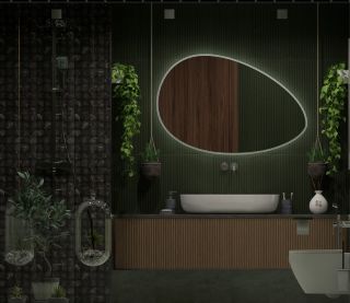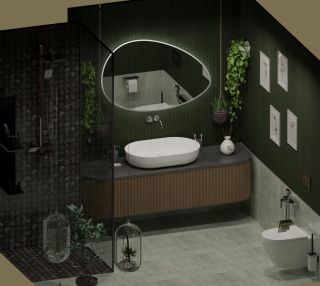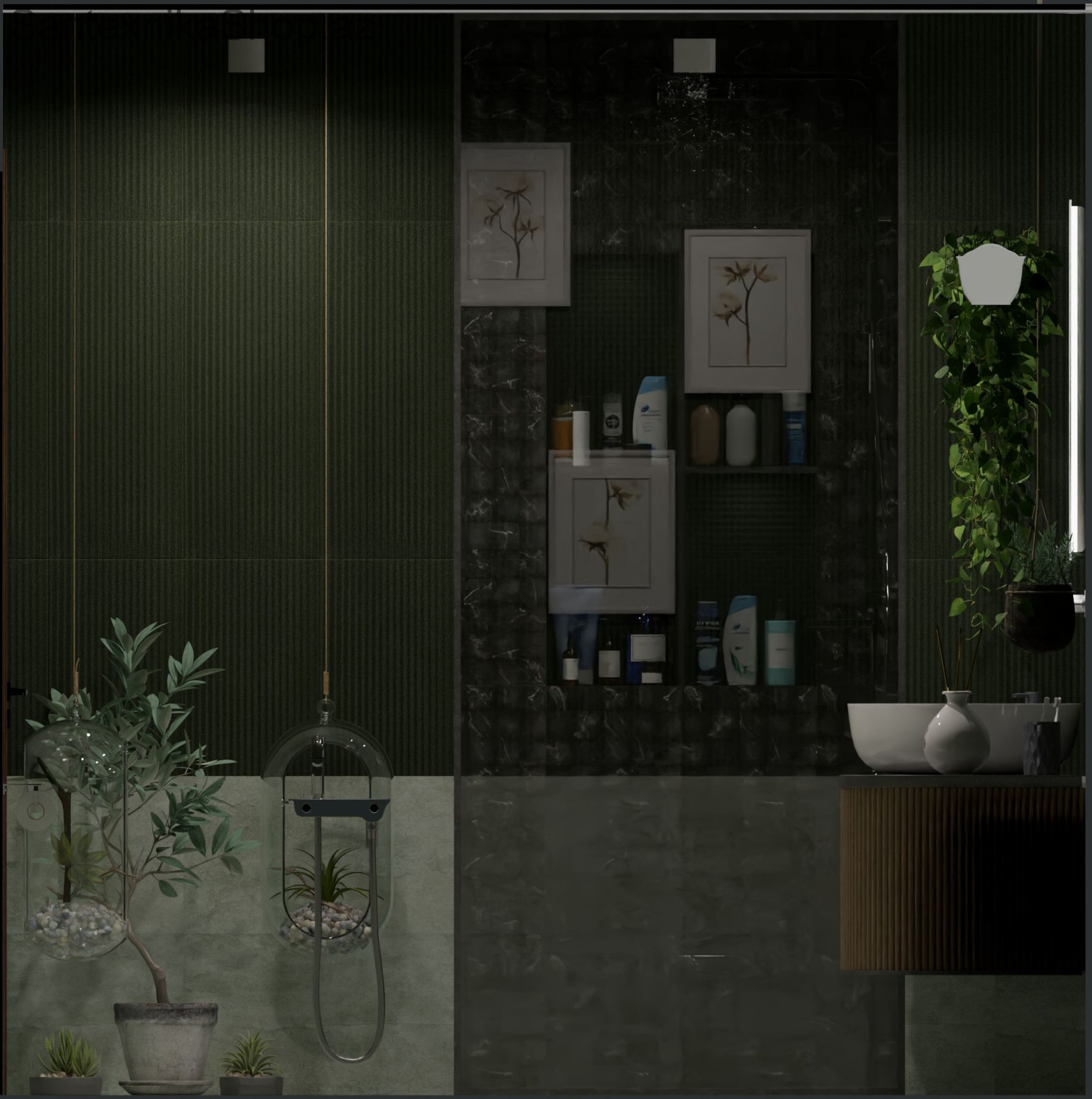 Bu yaşıl bitki hamam dizaynı təbii estetika və müasir funksionallığı birləşdirərək, evinizə yaşıl oazis hissi verir. Qaranlıq yaşıl divar panelləri və qara daş teksturalı duş zonası sərinlik yaradır, oysa asılı bitki və saksı bitkiləri (zambak, filodendron və sukulentlər) təzəlik qatır. Oval taxta ramkalı LED işıqlı güzgü, yuvarlaq ağ yumaqüstü və taxta teksturali yumaqüstü dolabı minimalist şəkildə birləşir. Şüşə duş kabini, qara armatürlər və ağ tualet praktik detallar təmin edir. 3D renderlərlə təqdim olunan bu model ekoloji və zərif hamam həlli axtaranlar üçün idealdır.