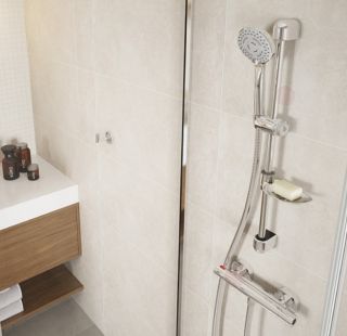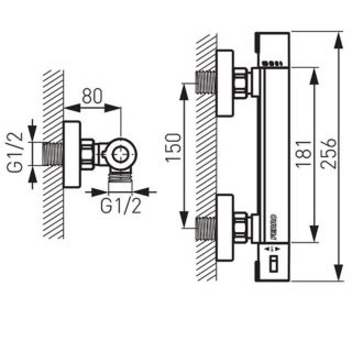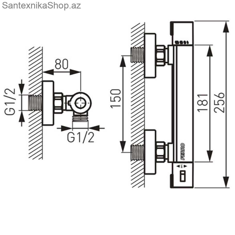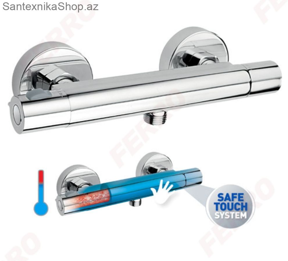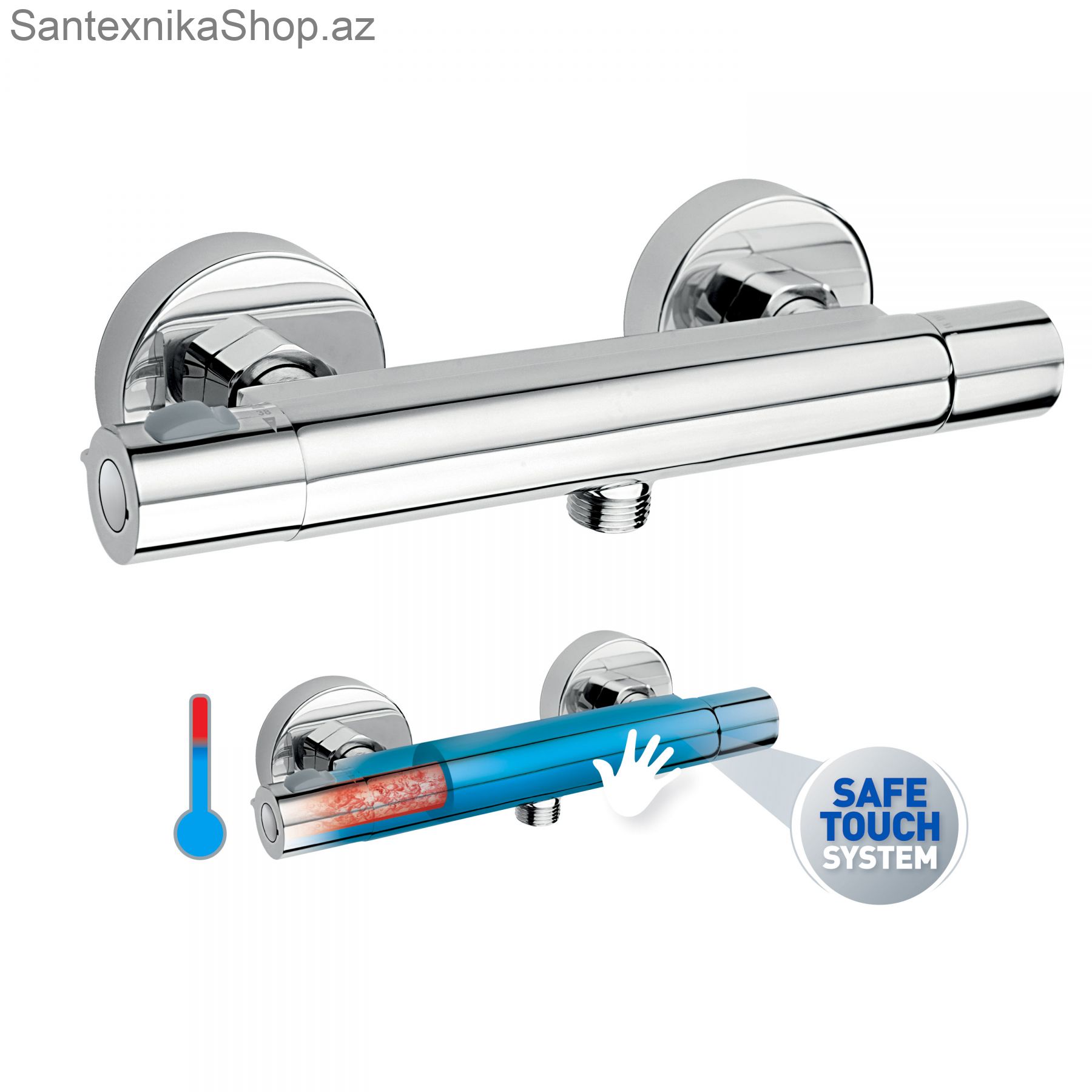 termostatik tənzimləyici Safe Touch System - bədən istilənmir Safe Stop 38°C - isti su kilidi divar montajı G1/2 eksantrik əlaqə aralığı 150 ± 20 mm G1/2 duş bağlantısı duş dəsti daxil deyil xrom
