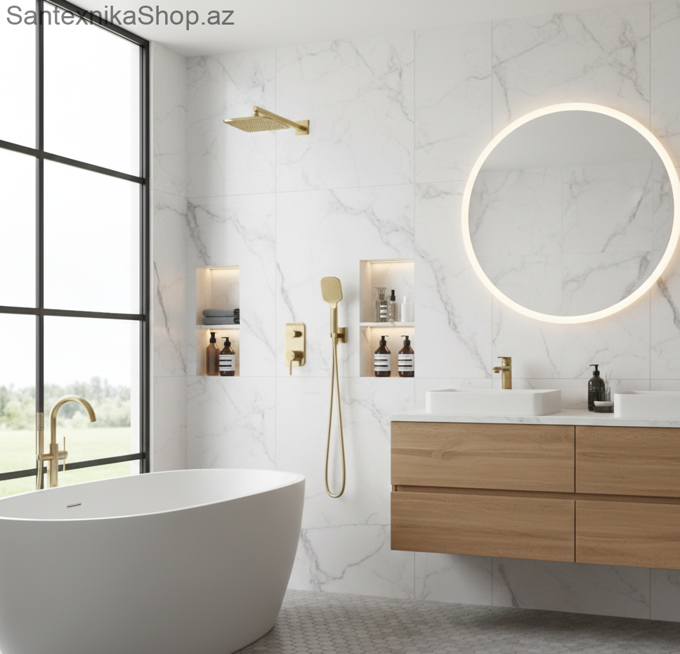 Vanna otağında duş qəbulu zamanı boruların kənardan görünməsi həm vizual olaraq dağınıq bir mühit yaradır, həm də kiçik sahəli vanna otaqlarını daha da dar göstərir. Bundan əlavə, standart xrom rəngli duş sistemləri artıq modern və eksklüziv dizayn axtarışında olan istifadəçiləri qane etmir. Bu problem, vanna otağını tam minimalist üslubda yeniləmək, bütün texniki detalları divarın içində gizlətmək və eyni zamanda lüks bir otel atmosferi yaratmaq istədikdə yaranır. İkiyönlü sistem (yuxarı duş və əl duşu) həm praktiklik, həm də estetik bütövlük tələb edən məkanlar üçün vacibdir. Bazarda olan bir çox ankastre sistemlərin quraşdırılması mürəkkəbdir və daxili mexanizmləri suyun təzyiqinə qarşı dayanıqsız olur, bu da divar daxili sızma riskini artırır. Həmçinin, mat qızılı rəngli məhsulların çoxu zamanla parlaqlığını itirir və ya səthi su ləkələri ilə örtülərək estetik görünüşünü itirir. Teska Alinda seriyası həm mühəndislik, həm də dizayn baxımından bu çatışmazlıqları aradan qaldırır. İkiyönlü idarəetmə sayəsində suyun axınını yuxarı tropik duş başlığı və əl duşu arasında asanlıqla yönləndirə bilərsiniz. Teska-nın xüsusi texnologiyası ilə tətbiq olunmuş Mat Gold örtüyü cızılmalara və korroziyaya qarşı maksimum dözümlüdür. Sistemin daxili gövdəsi yüksək keyfiyyətli materialdan hazırlandığı üçün uzun illər divar daxilində sızmasız və etibarlı xidmət təmin edir. Teska Alinda (Mat Gold) dəstini seçməklə vanna otağınıza aristokratik bir incəlik və genişlik qatacaqsınız. Bütün artıq boruların gizlədilməsi sayəsində təmizlik işləriniz asanlaşacaq, mat qızılı rəngin yaratdığı lüks abu-hava isə hər duş qəbulunu bir spa proseduru qədər xoş edəcək. Bu dəst illər boyu öz keyfiyyəti və dəbli görünüşü ilə evinizin ən diqqətçəkən detalı olacaq.