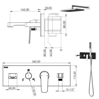 TESKA | Life divar içi duş seti | üç yönlü, siyah cam, kod: AS 3100B