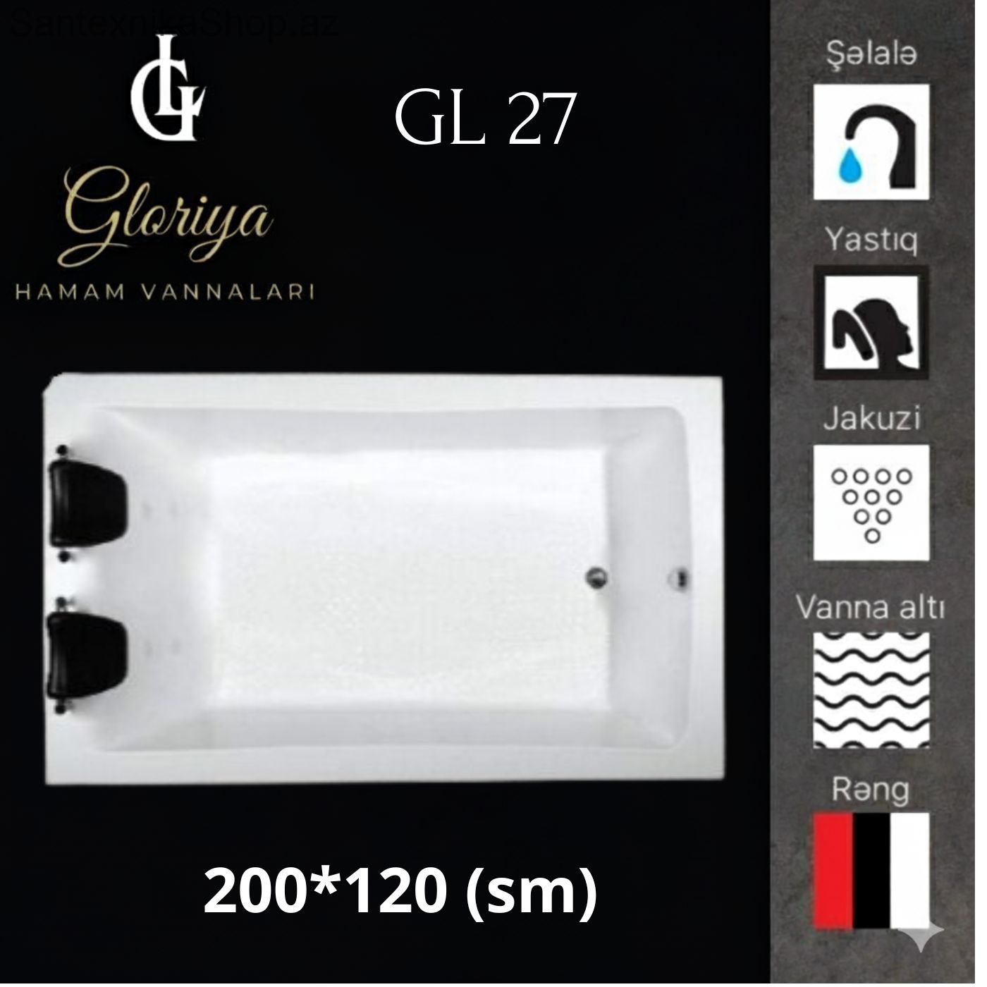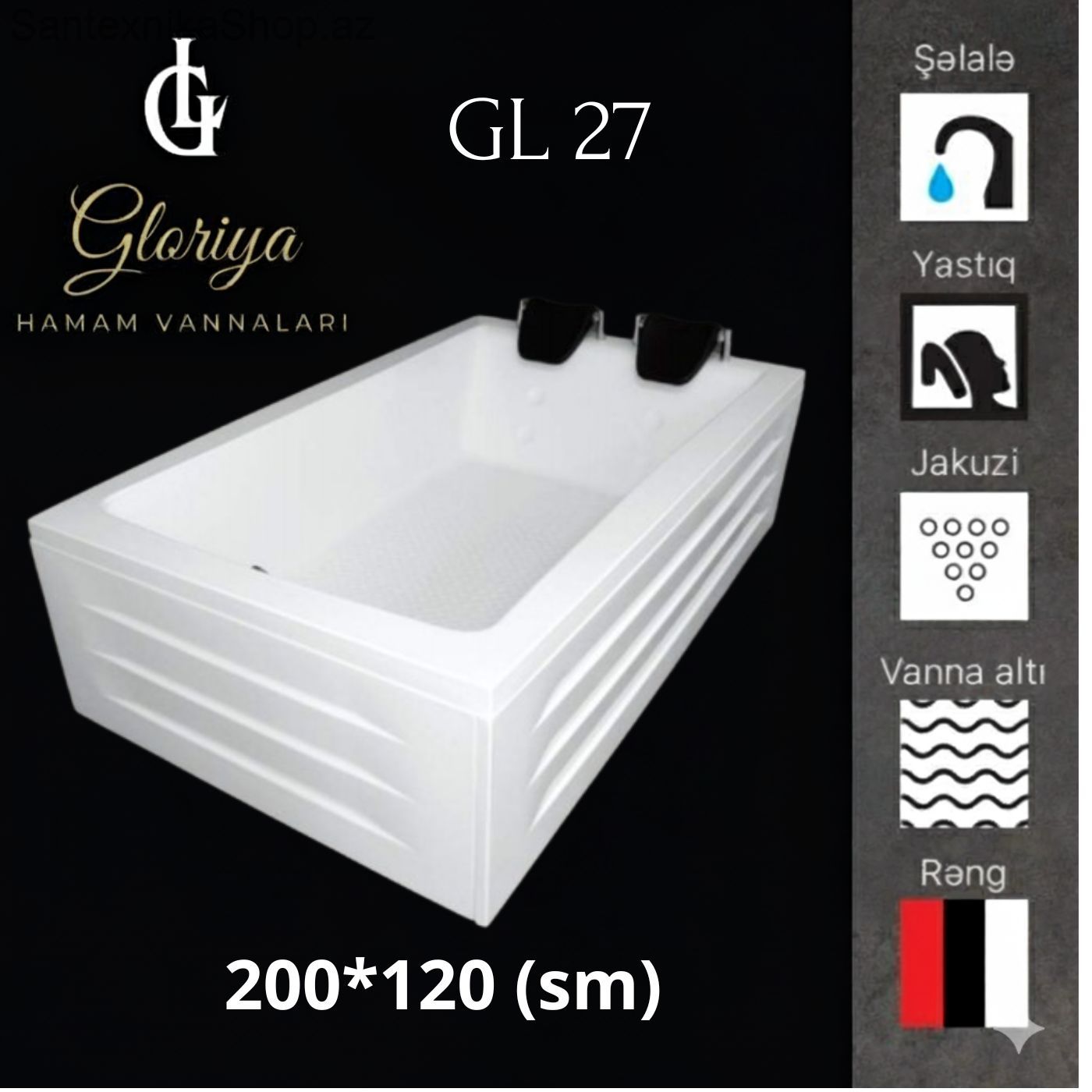 Komfort və geniş daxili həcm. Təsvir: GLORİYA GL-27 modeli komfortu sevənlər üçün xüsusi layihələndirilib. 2 metr uzunluğu və 120 sm eni ilə hər bir detalı bədən quruluşuna uyğun dizayn edilmişdir. Yüksək keyfiyyətli akril materialı suyun istiliyini uzun müddət qoruyur, bu da sizə daha uzun və keyfiyyətli dincəlmə imkanı verir. Hamar və antibakterial səthi sayəsində təmizliyi çox asandır.